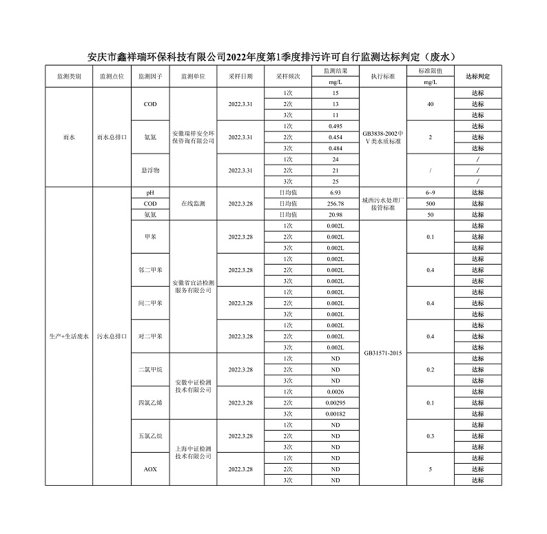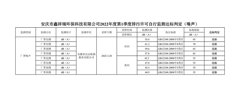 安慶市鑫祥瑞環(huán)??萍加邢薰?022年第1季度排污許可自行監(jiān)測公示