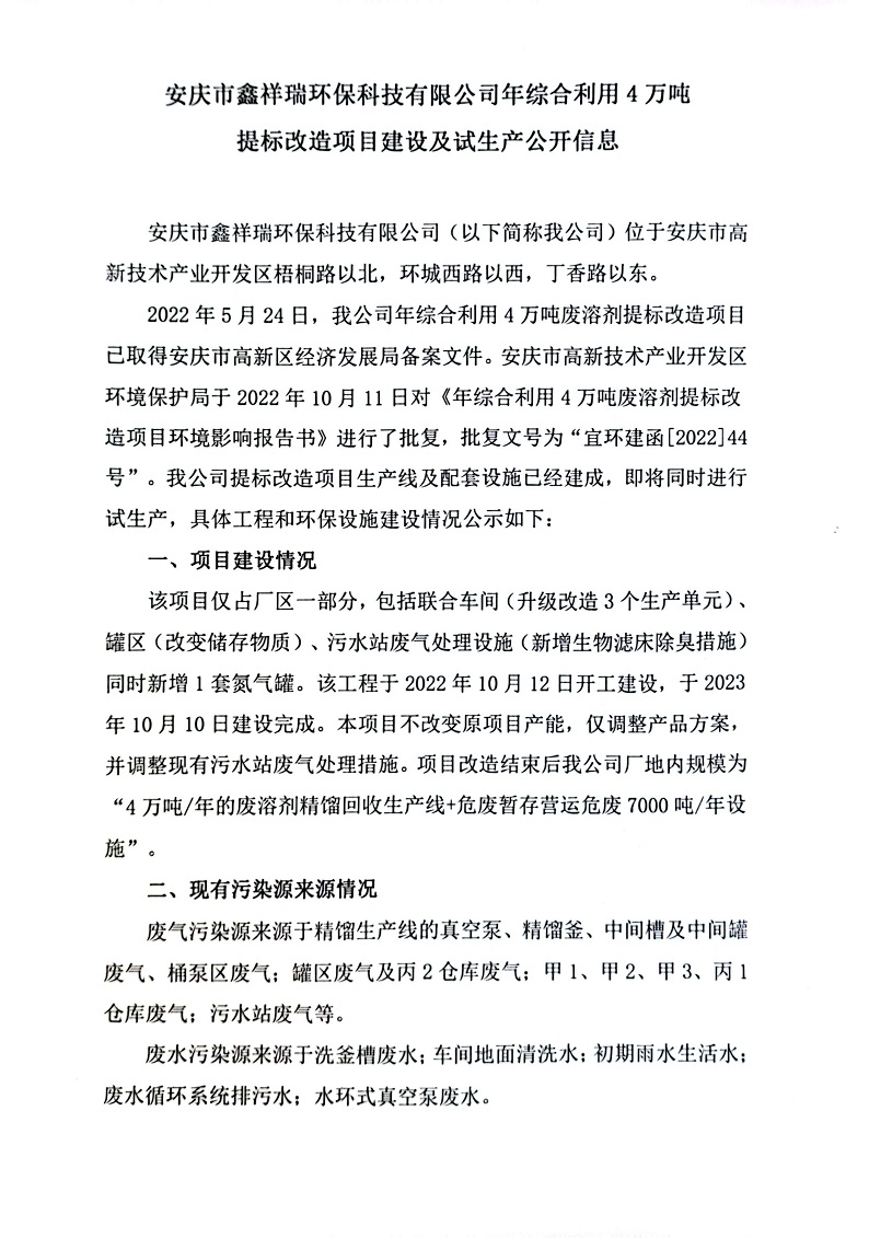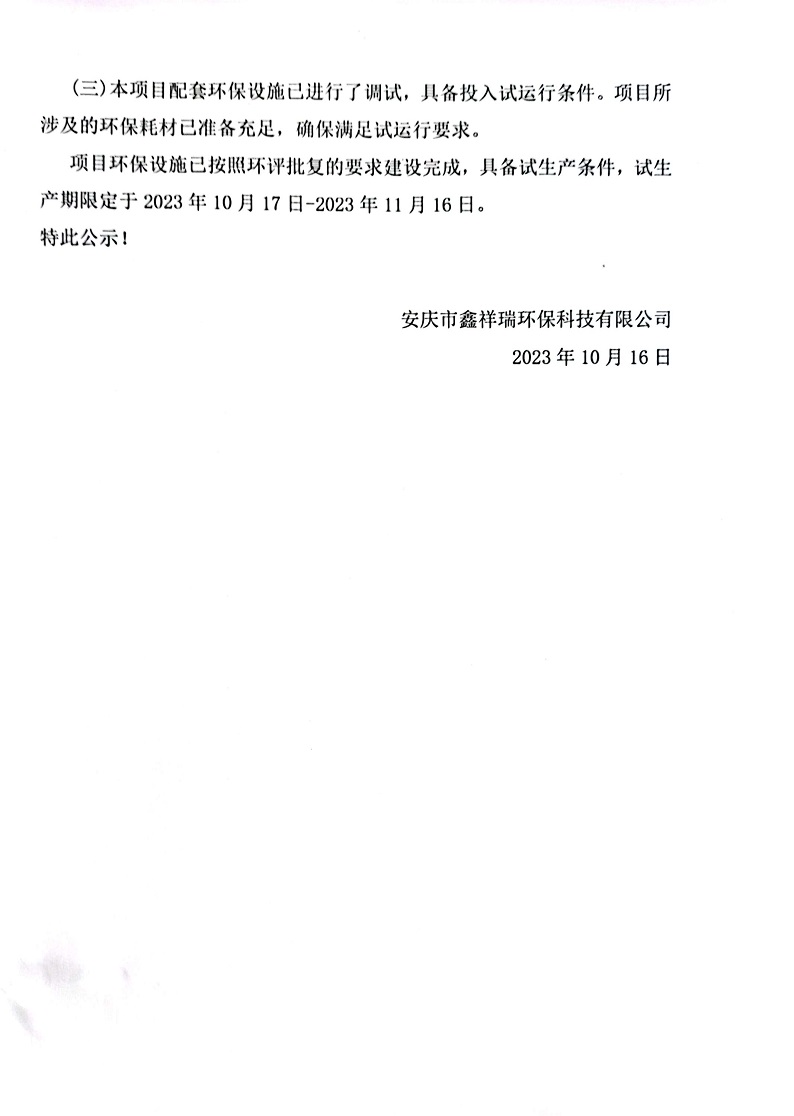 安慶市鑫祥瑞環(huán)保科技有限公司年綜合利用4萬噸提標(biāo)改造項(xiàng)目建設(shè)及試生產(chǎn)公開信息
